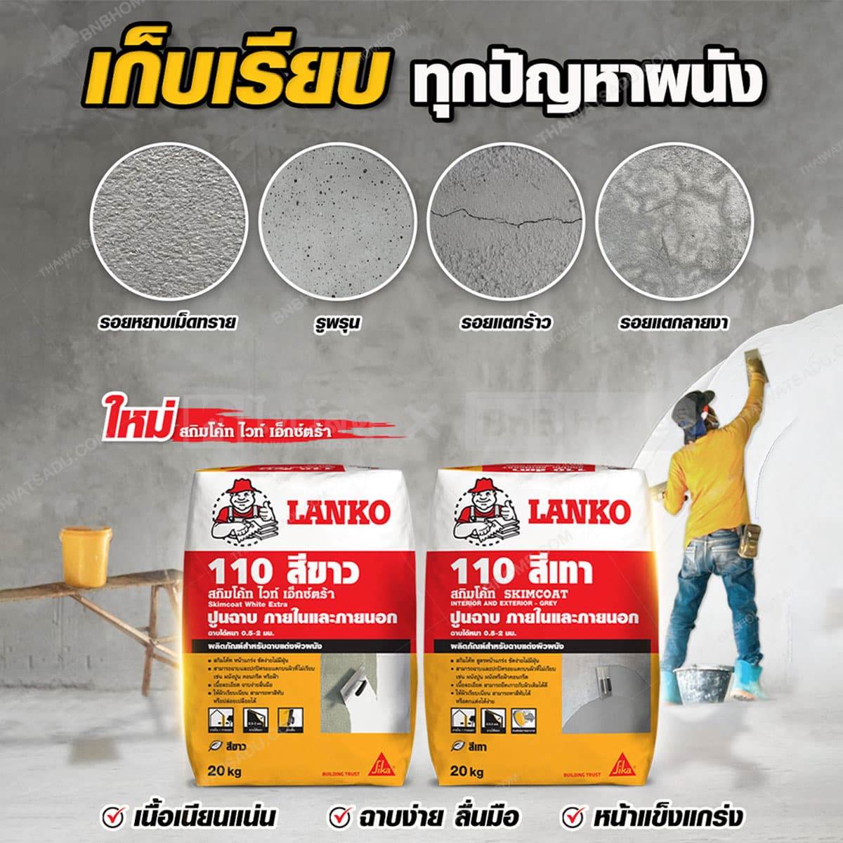 - ปูนฉาบบางผสมสำเร็จ ผลิตภัณฑ์สำหรับฉาบแต่งผิวผนังสูตรเฉพาะจาก LANKO